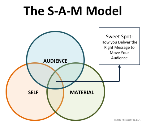 At the center of the three interlocking circles is your ‘Sweet Spot’, where YOU (Self) deliver the RIGHT MESSAGES (Material) that move your AUDIENCE in the desired direction. This model applies to all and any interactions, from one-to-one conversations, to small group meetings, to large group presentations, to broadcast communications. The principles apply in each scenario in different proportions dependent on the specifics of the interaction.